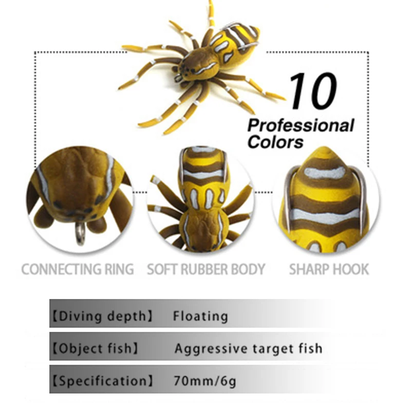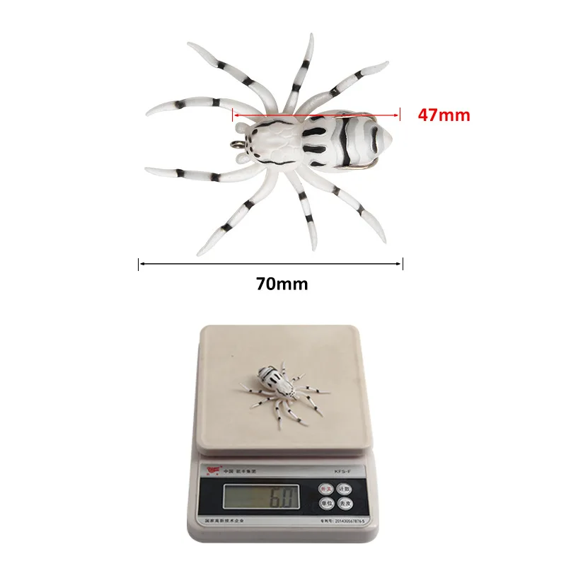 -Description: -4.7 cm (main trunk) 6 grams of spider bait device, silicone bait, weed-free soft bait, artificial bait, realistic design of fishing bait. -Material: Silicone -I can't describe the movement of this spider in words, it's really great. It has a hollow body and an anti-hanging design. The walking legs are -due to the ingenious joint design. When the spider moves on the water, it can stride, slide and jump slightly. -The lure spider has a self-balancing system in its sternum to ensure coordinated natural movements, wirelessly close to the real artificial artificial bait. -Notes: -As the products show differently under different lights, please refer to the actual product. Thank you!